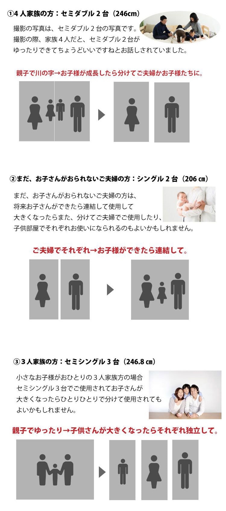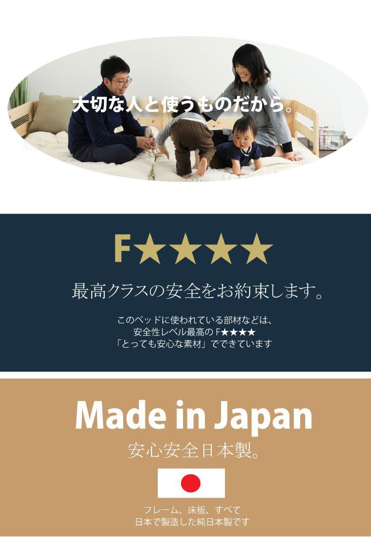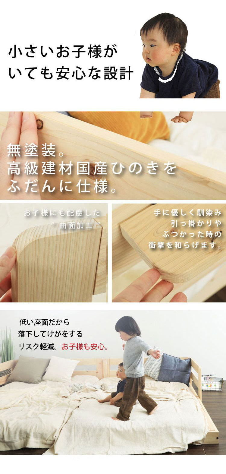国産のヒノキ材を贅沢に使用したローベッド。金具でピッタリ連結できるので家族で川の字で寝る事ができます。