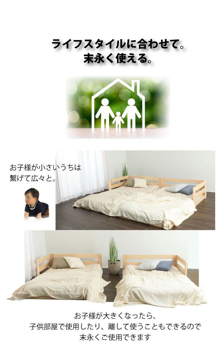 国産のヒノキ材を贅沢に使用したローベッド。金具でピッタリ連結できるので家族で川の字で寝る事ができます。