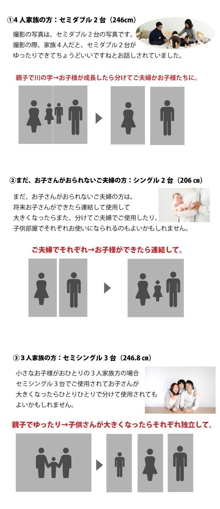 国産のヒノキ材を贅沢に使用したローベッド。金具でピッタリ連結できるので家族で川の字で寝る事ができます。