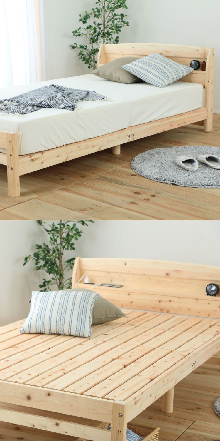 便利な棚コンセント付きのヒノキベッド。佐川急便で配送可能。2口コンセント付き。1500W