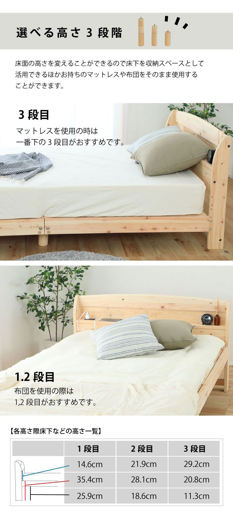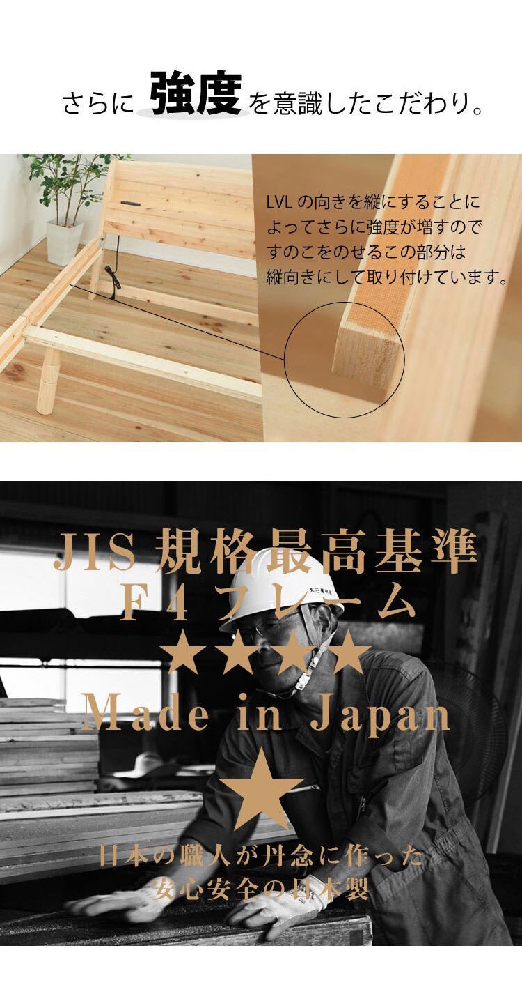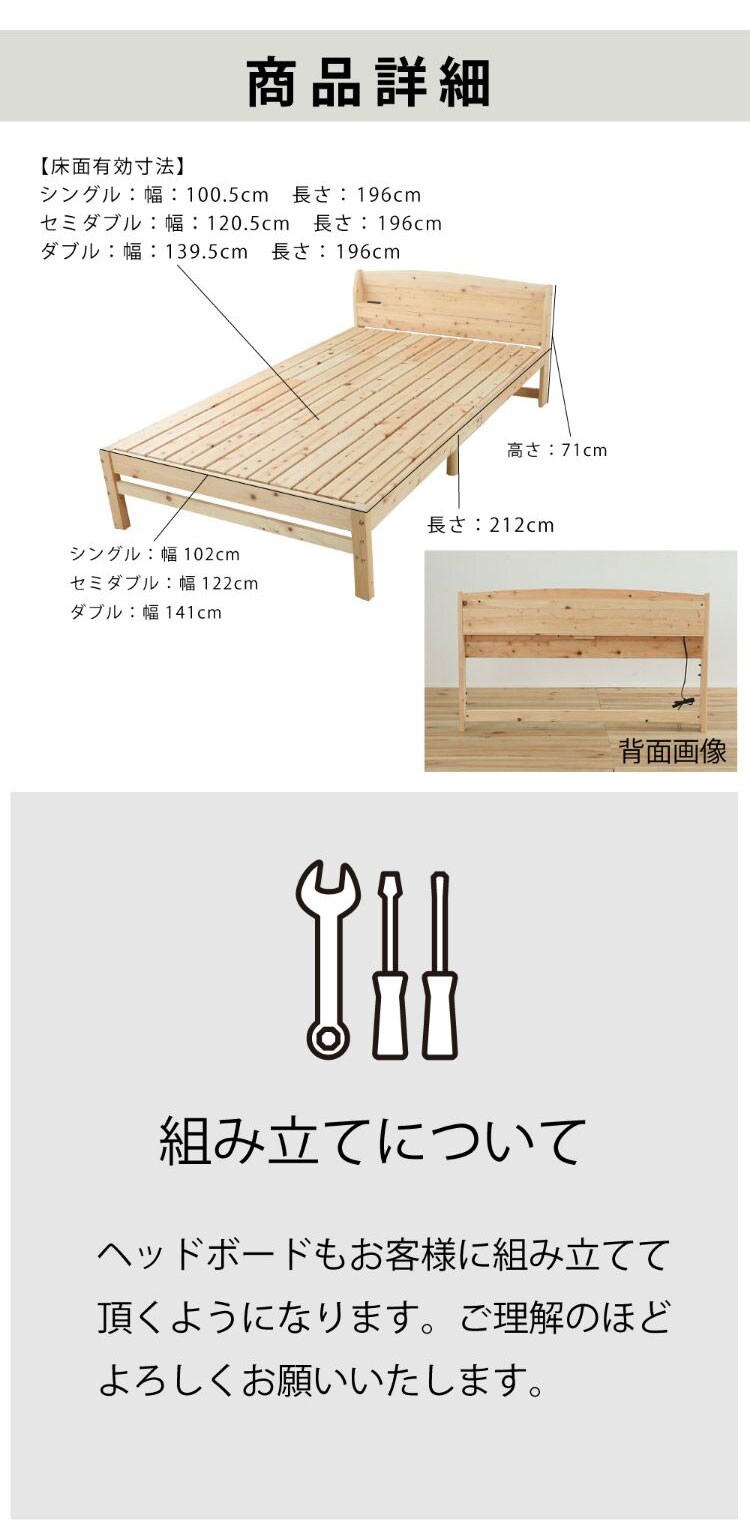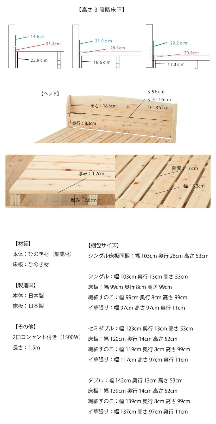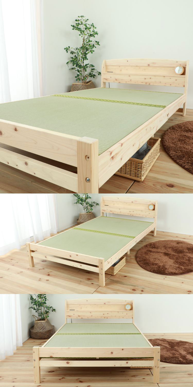 便利な棚コンセント付きのヒノキベッド。佐川急便で配送可能。2口コンセント付き。1500W。イグサ床板タイプ