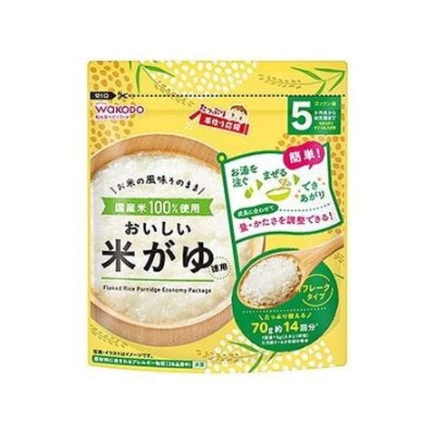 お湯をそそいで混ぜるだけで、簡単になめらかなおいしいおかゆができる!成長にあわせて、量、かたさを調整できる。国産米100%使用、お米の風味そのまま!フレークタイプのおいしい米がゆです。着色料・香料・保存料不使用