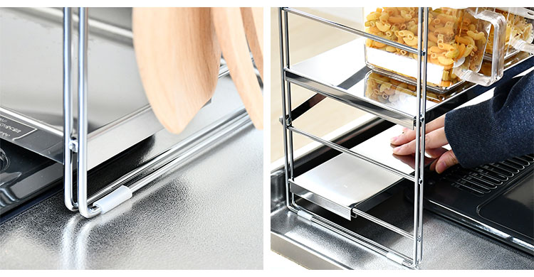 一番下の棚は、排気口カバーになっています。スライド式なためわざわざラックを移動させることなく使用できます。また、排気口カバーの上にフライパンなどを一時置くこともできます。
