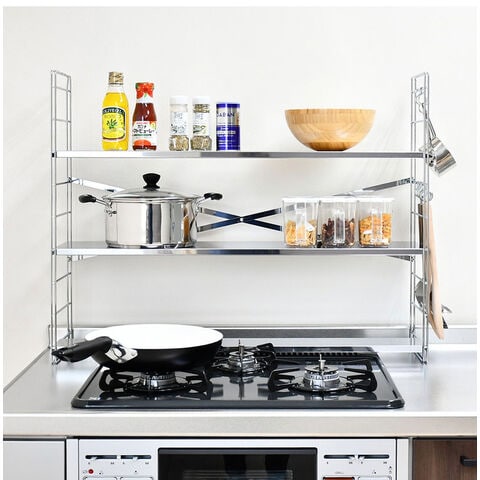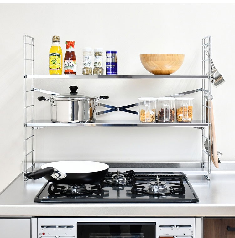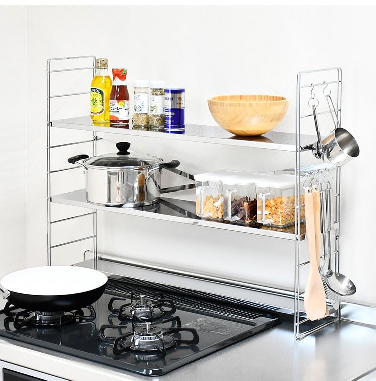 コンロ幅75cm用。コンロ奥ラックと排気口カバーが一緒になった多機能ラック。