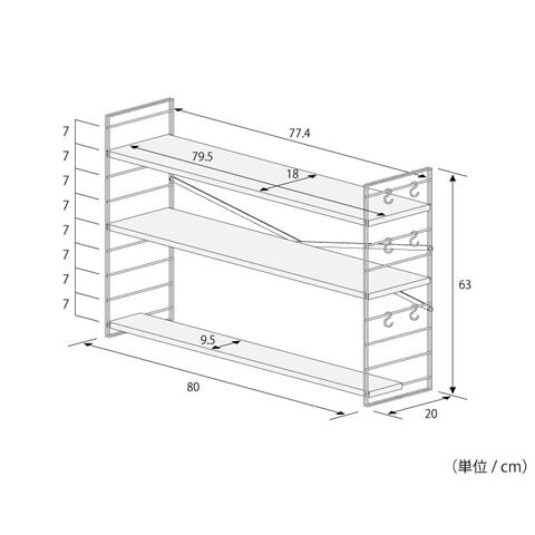 棚は7cmピッチで調整が可能です。ビス止めではないため簡単に取り外しができ高さを変えることができます。