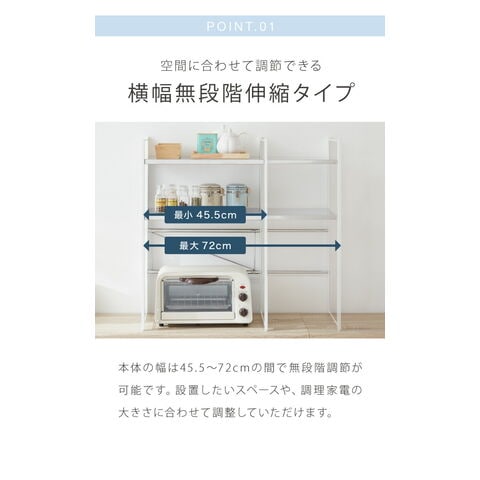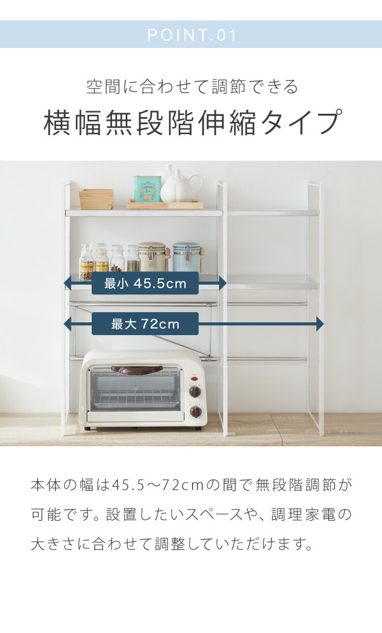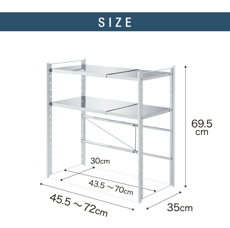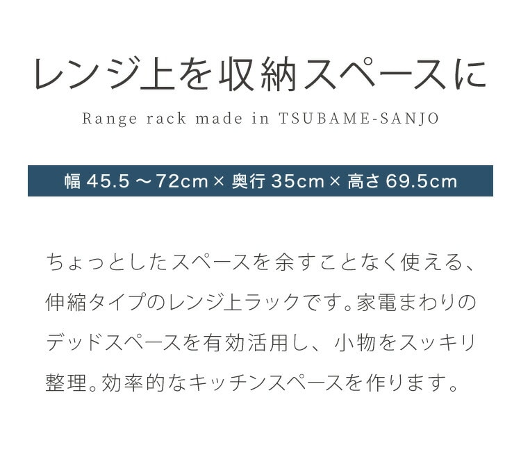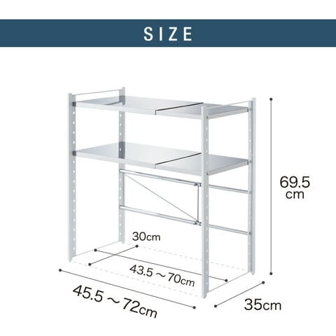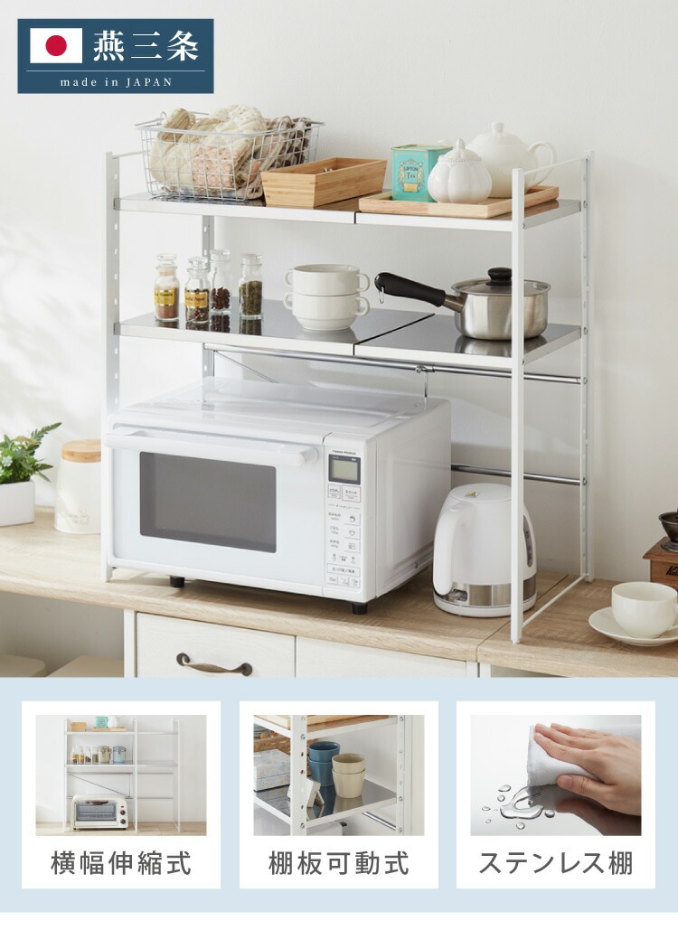 日本製 燕三条 伸縮レンジ上ラック 2段 ステンレス棚 キッチン家電をまとめて収納! 幅45.5~72 高さ調節 キッチンラック レンジ上 伸縮 棚 電子レンジ 家電上ラック カウンター上収納 頑丈 おしゃれ【送料無料】