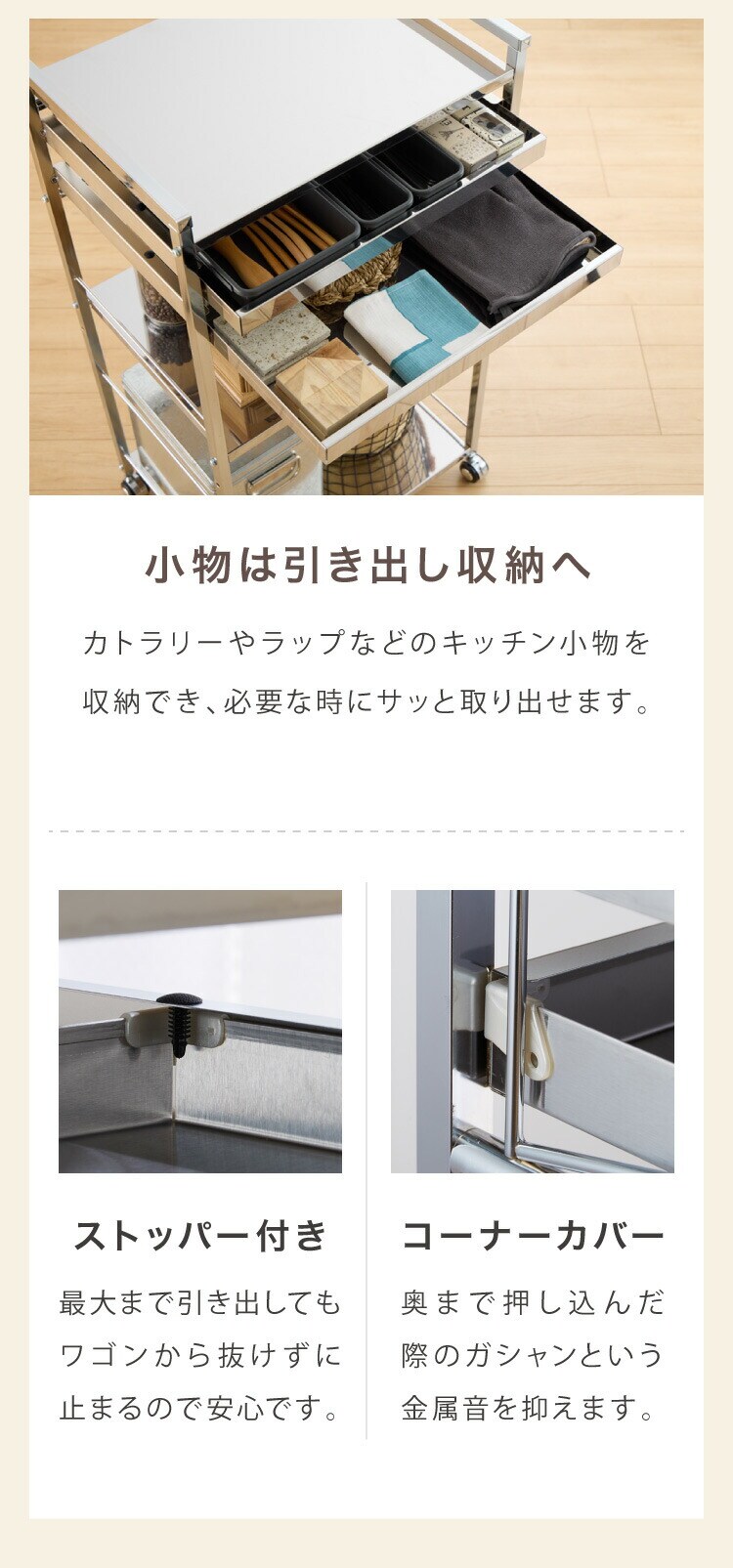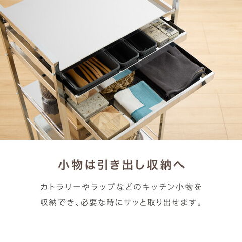 引き出しと複数の棚が付いているため、調理器具や食材、その他のキッチン用品を整理整頓して収納することができます。