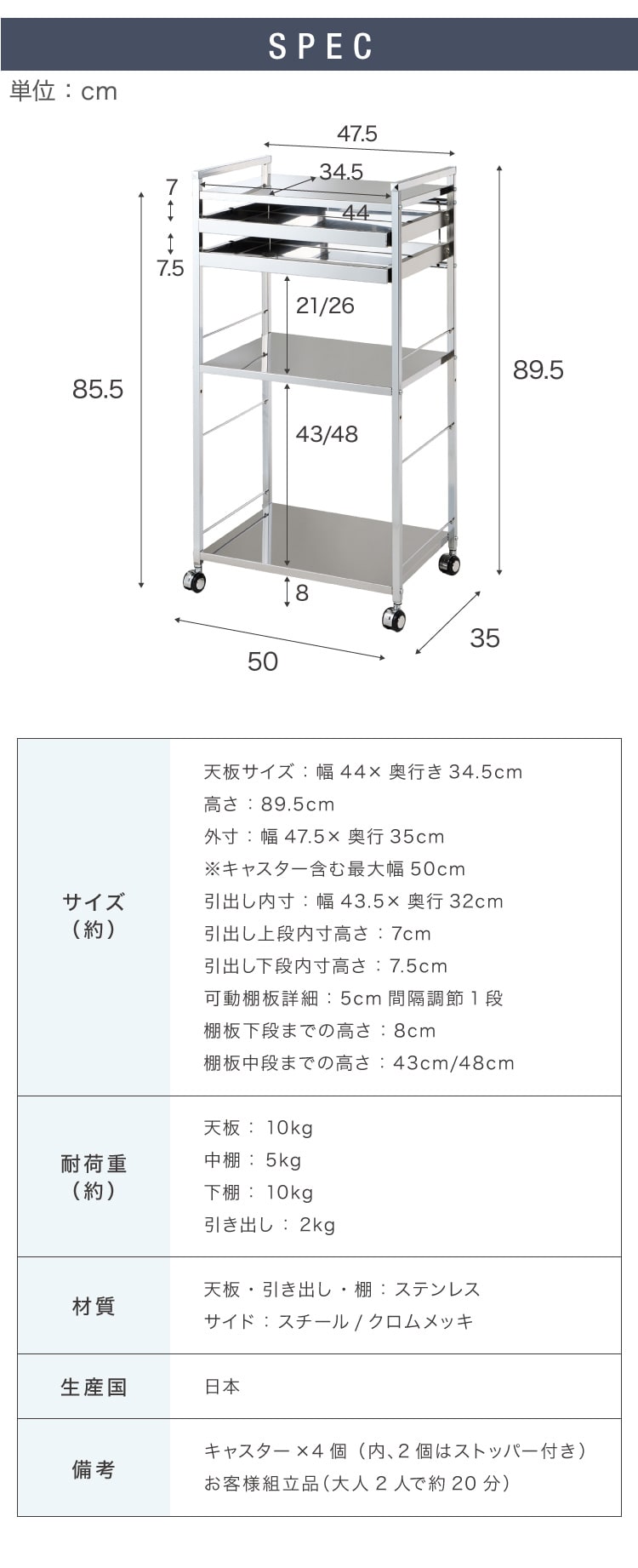 日本製 燕三条 ステンレス作業台ワゴン 幅50cm 2段 引出付き ハンドル付き キッチンワゴン 作業台 調理台 スリム キャスター付き おしゃれ ステンレス天板 シルバー ステンレスワゴン キッチンラック【送料無料】