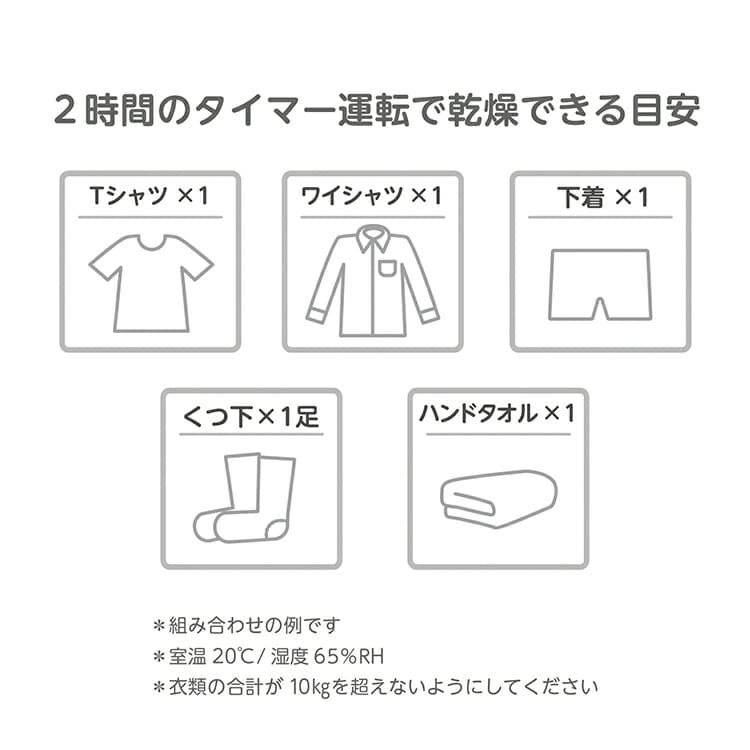 一度に9着まで乾燥可能。また1~7時間ごとにタイマーも設定できます。8時間運転後は自動的に電源がオフに。※耐荷重10kgまで