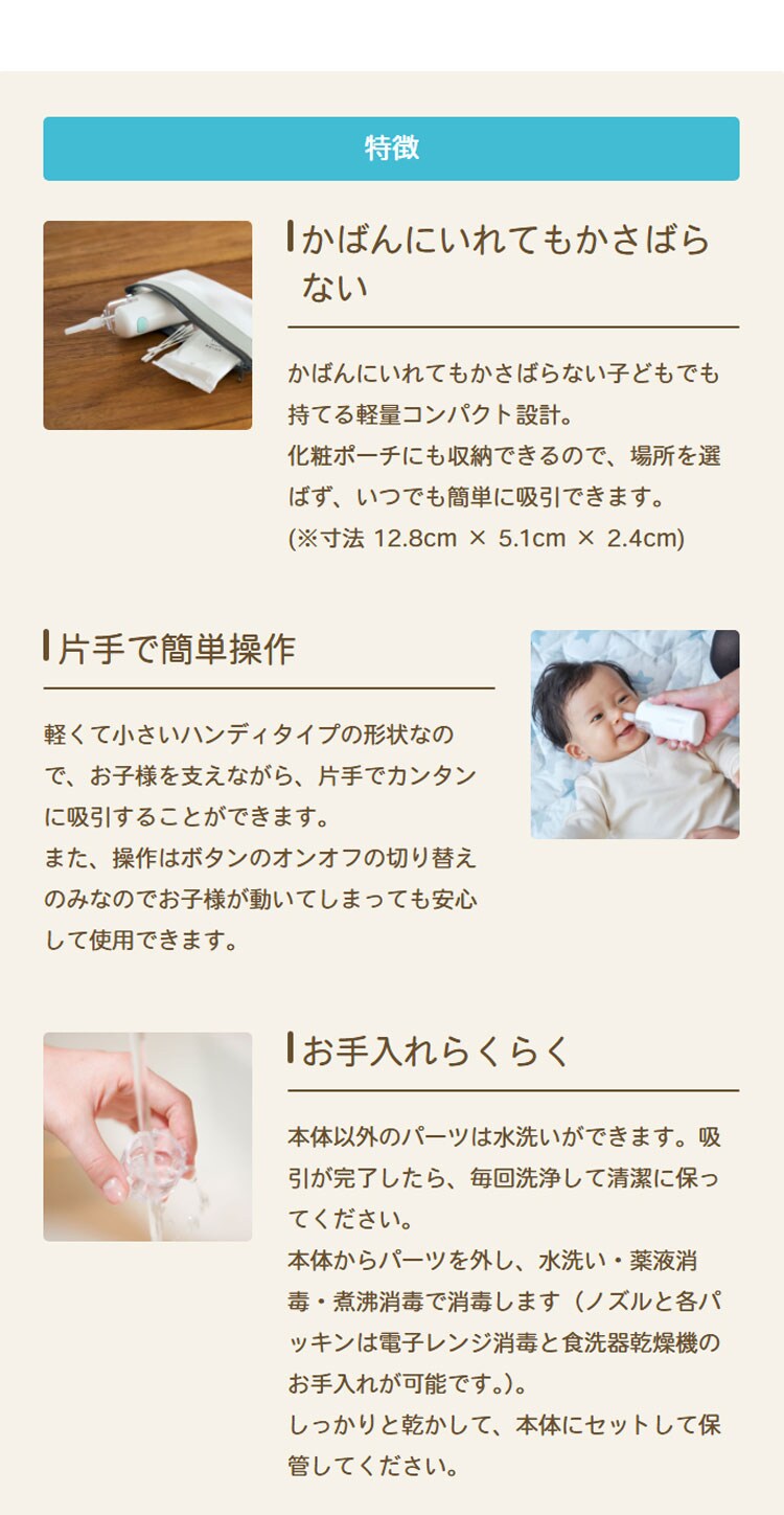 持ち運びに便利で、いつでもどこでも、鼻水吸引