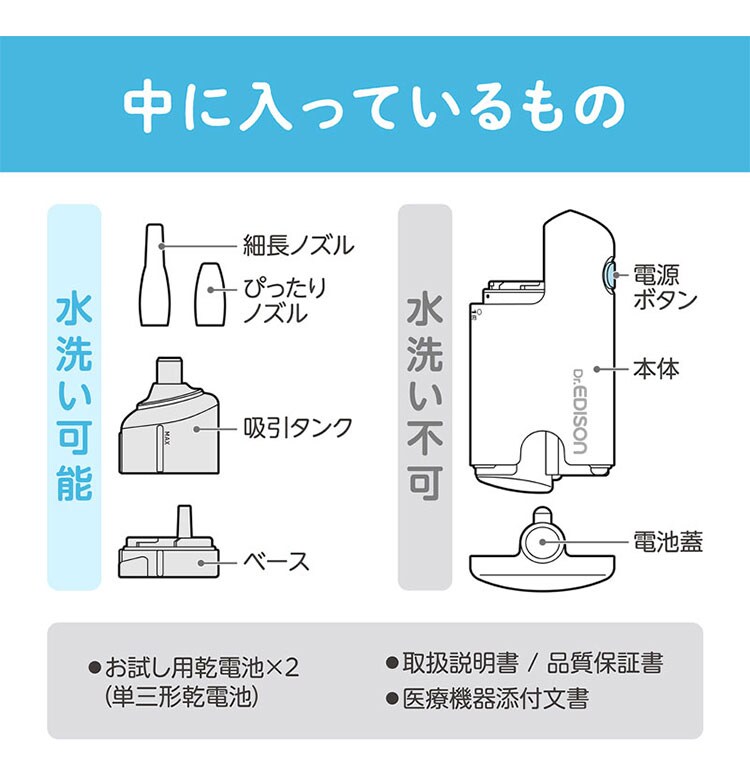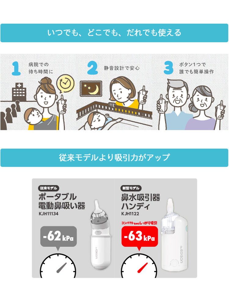 電動鼻水吸引器ハンディ 電池式 軽量 コンパクト 静音 簡単操作 お手入れ簡単 防水 防塵 コードレス 大人も 花粉症 介護 ホワイト アイボリー 管理医療機器 Dr.EDISON KJH1122 KJH110410【ポイント10倍】【送料無料】