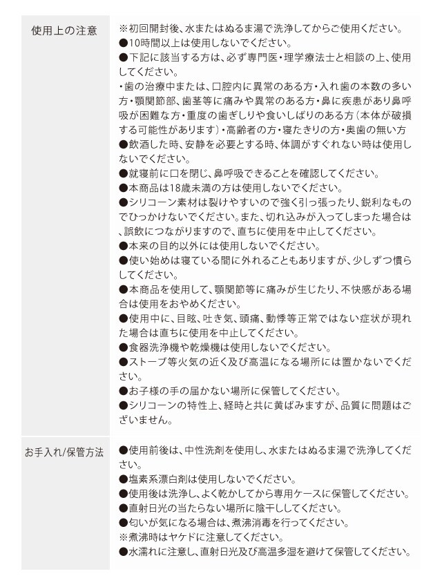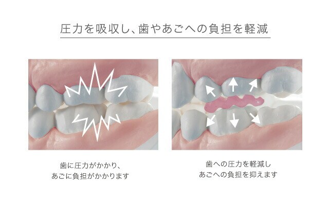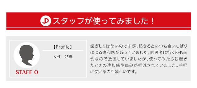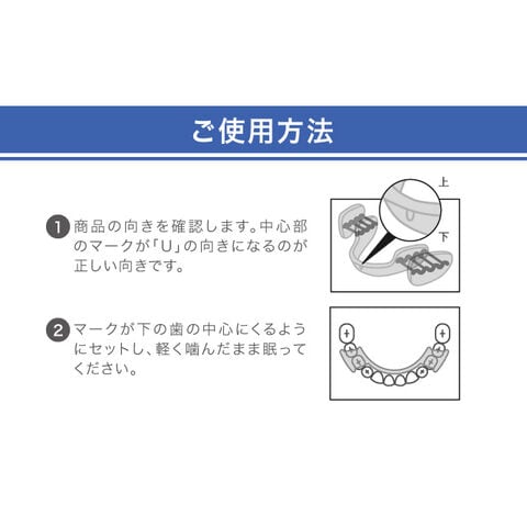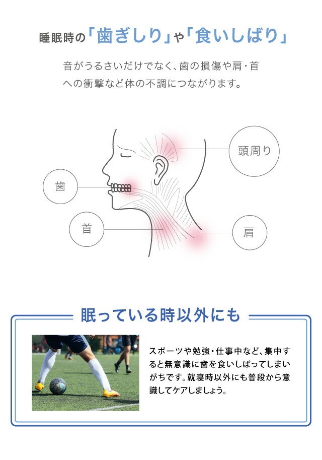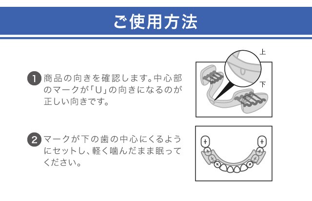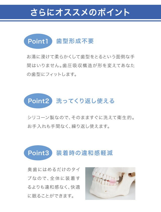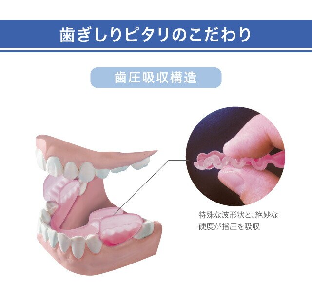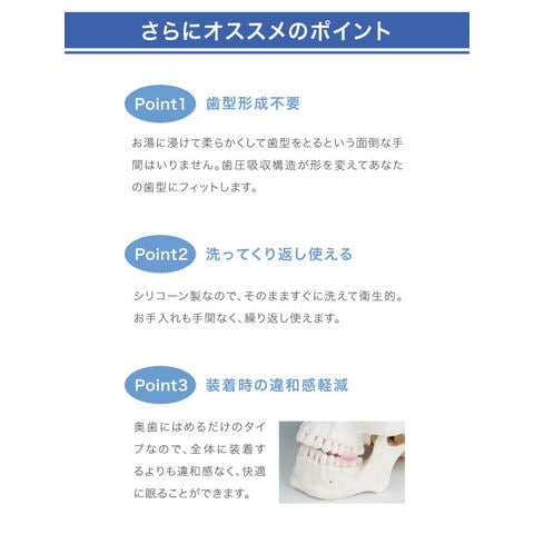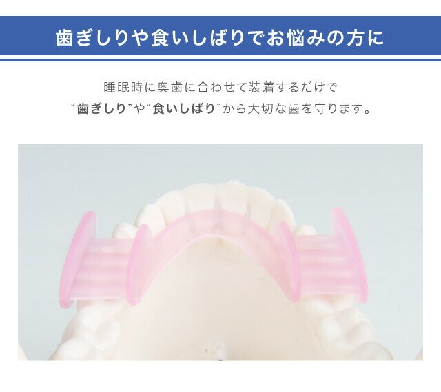 当商品は、寝る時にはめるだけで歯ぎしりや食いしばりを簡単に防ぐことができます。噛み合わせ矯正ではないので、失敗が多い面倒な型どりが必要ありません。寝る時にはめるだけで歯圧が吸収分散し、奥歯に負担をかけることなくピタっと止まります。