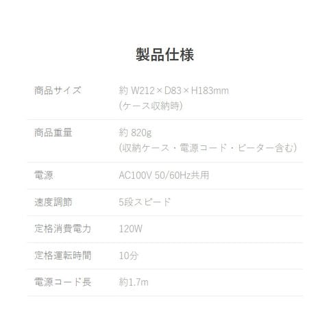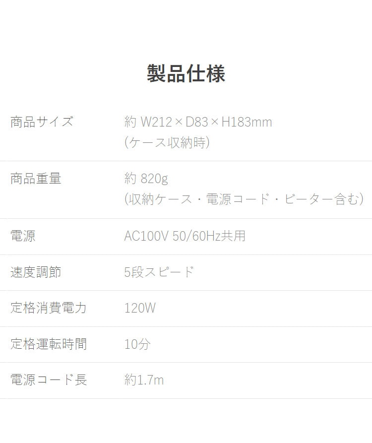 商品重量:約820g (収納ケース・電源コード・ビーター含む)