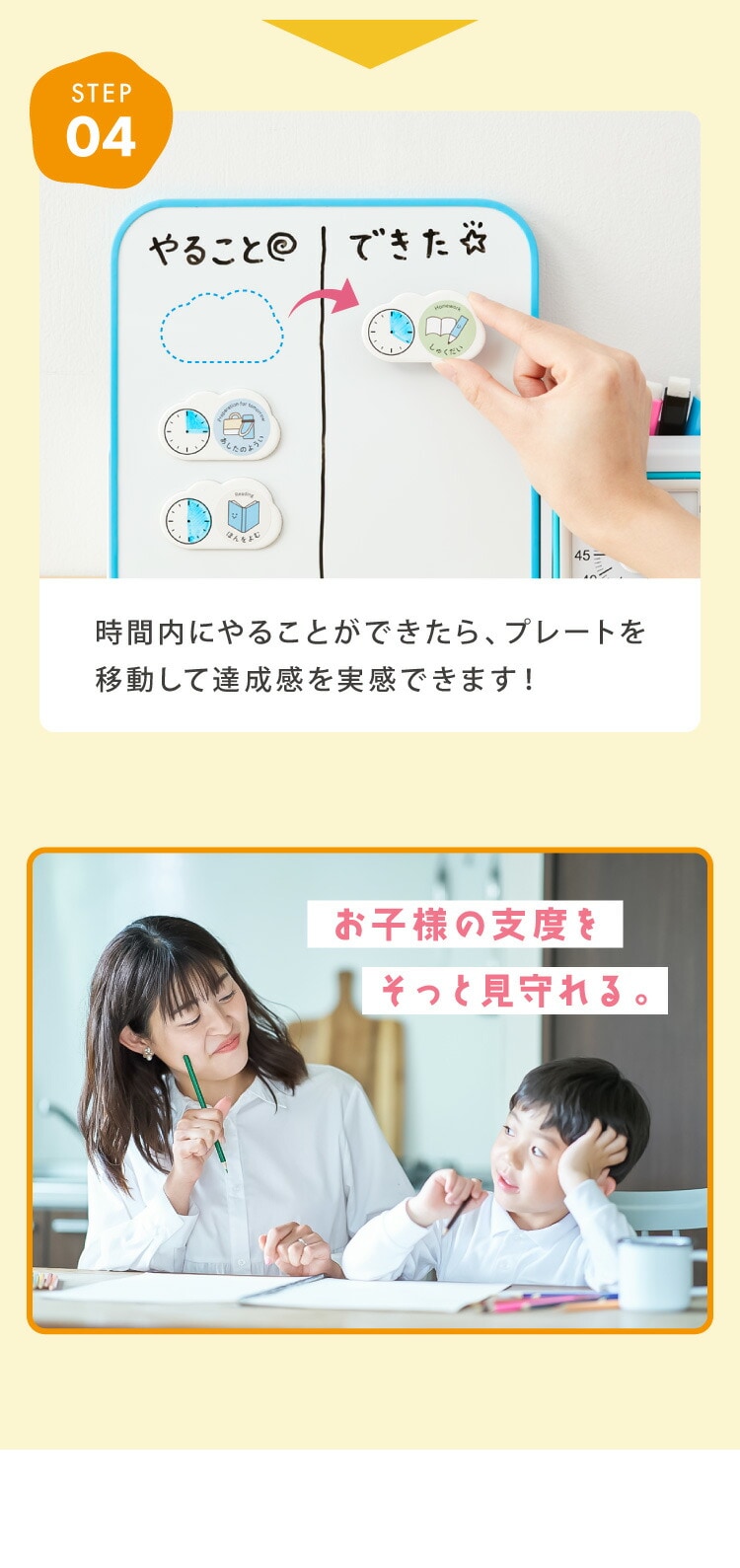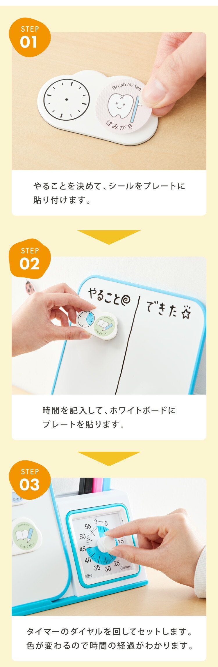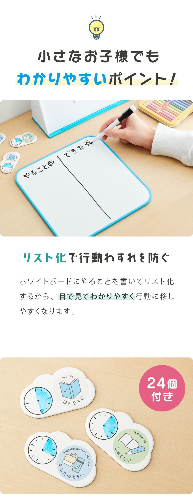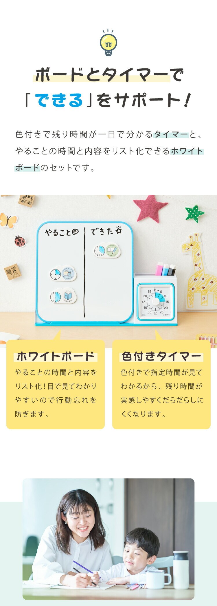色付きで残り時間が一目で分かるタイマーと、やることの時間と内容をリスト化できるホワイトボードのセットです。