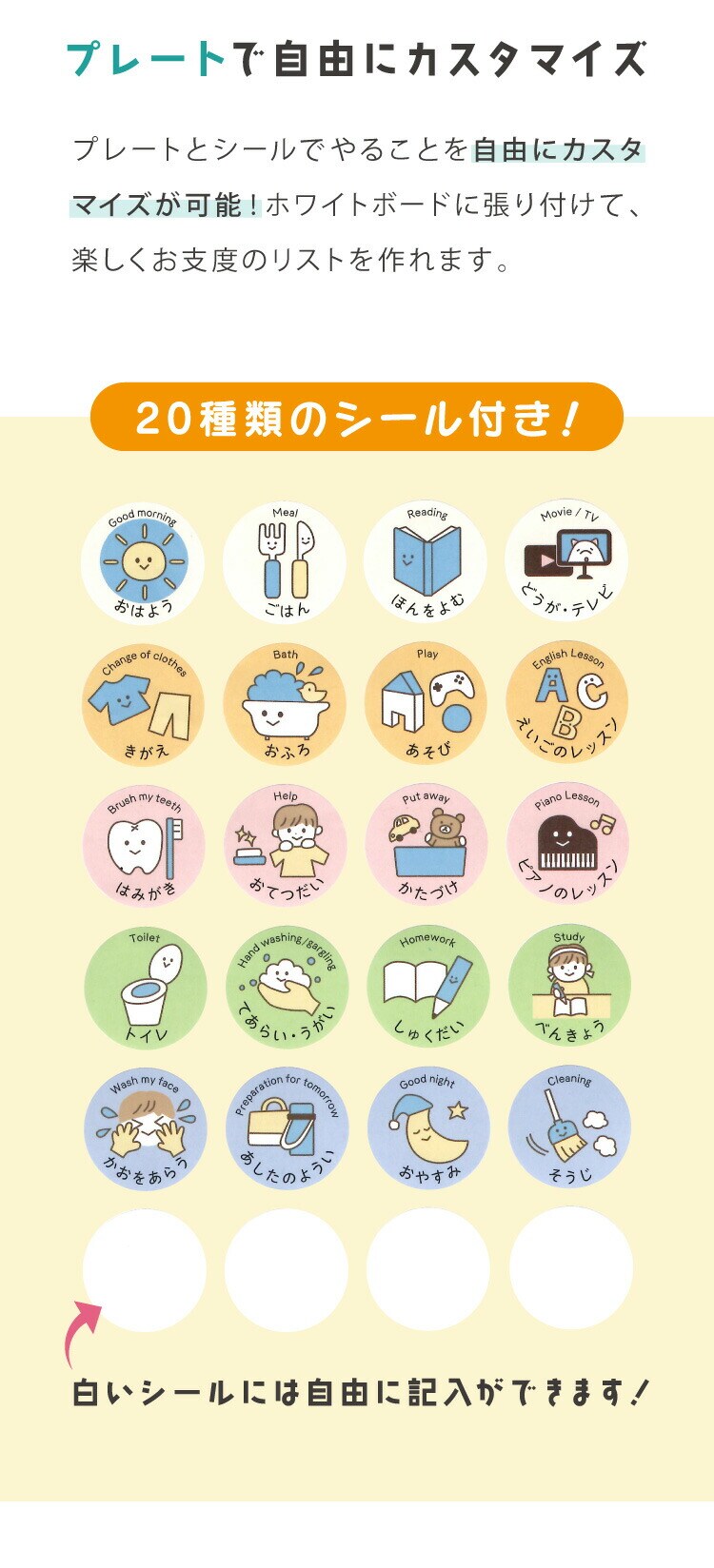 付属の「おしたくプレート」と「おしたくシール」を使って、ホワイトボードを自分専用にカスタマイズ。