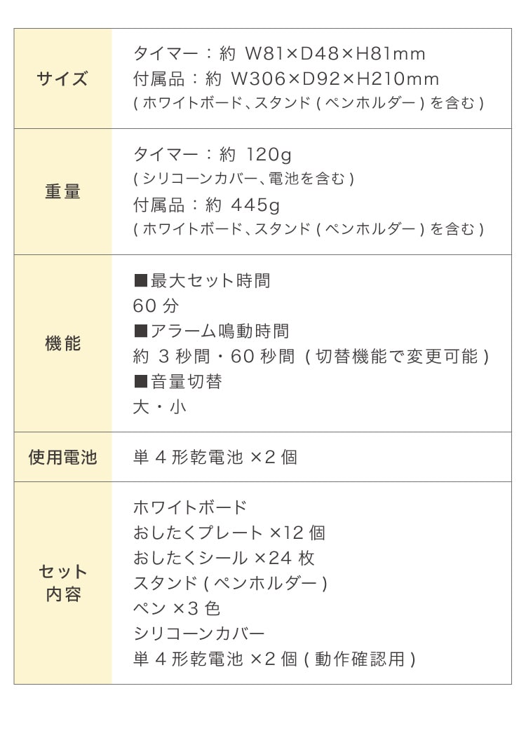タイマー:約 120g(シリコーンカバー、電池を含む)