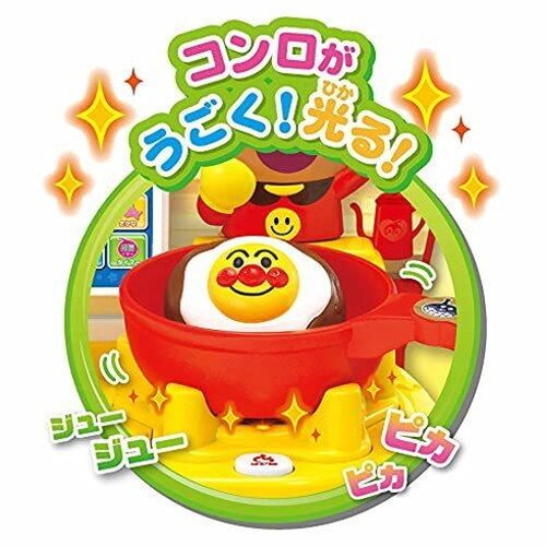 コンロは火をつけるとピカピカ光って、フライパンがゴトゴト動き、時間経過にそった効果音やおしゃべりが流れます。