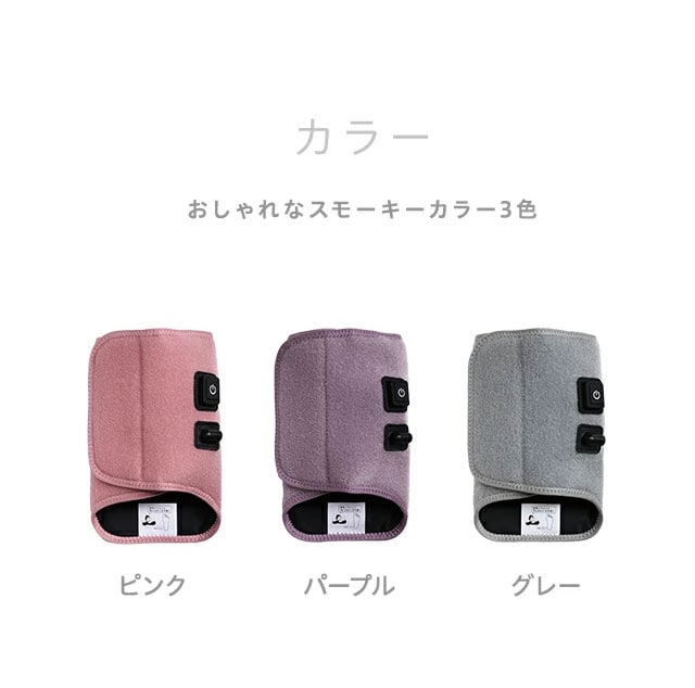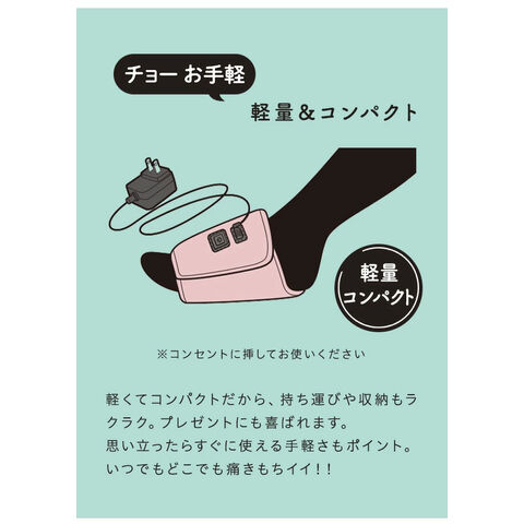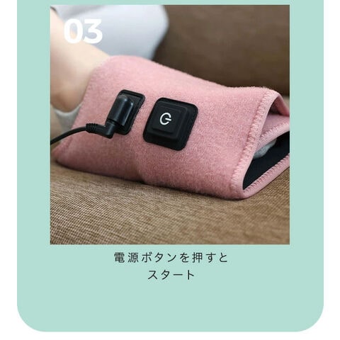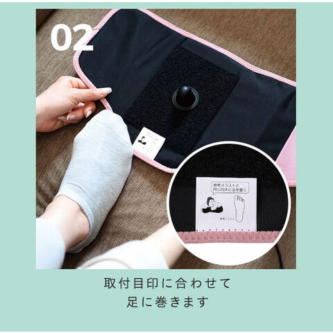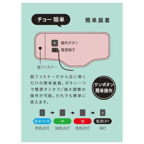 面ファスナーだから足に巻くだけの簡単装着。ボタン一つで電源オンオフ/強さ調整の操作が可能。だれでも簡単に使えます。