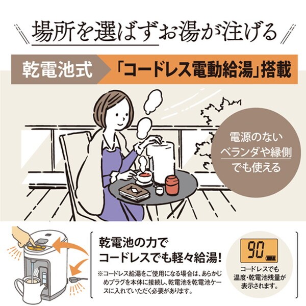 ●プラグをはずしても乾電池のチカラで、電動給湯できます。単3アルカリ乾電池2本でマグカップ4杯(約800ml)を1日使って約1年間OK!(電池別売)