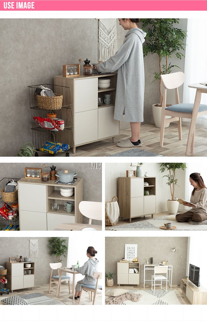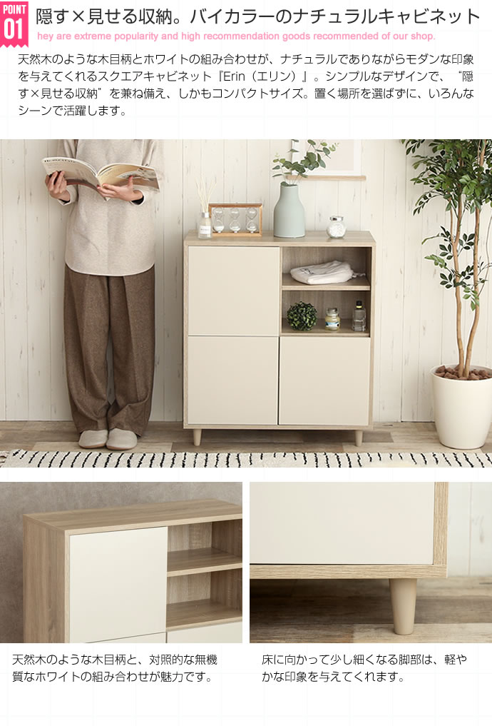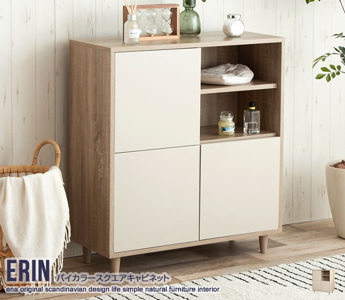 隠す収納と見せる収納を兼ね備えたバイカラーのキャビネット