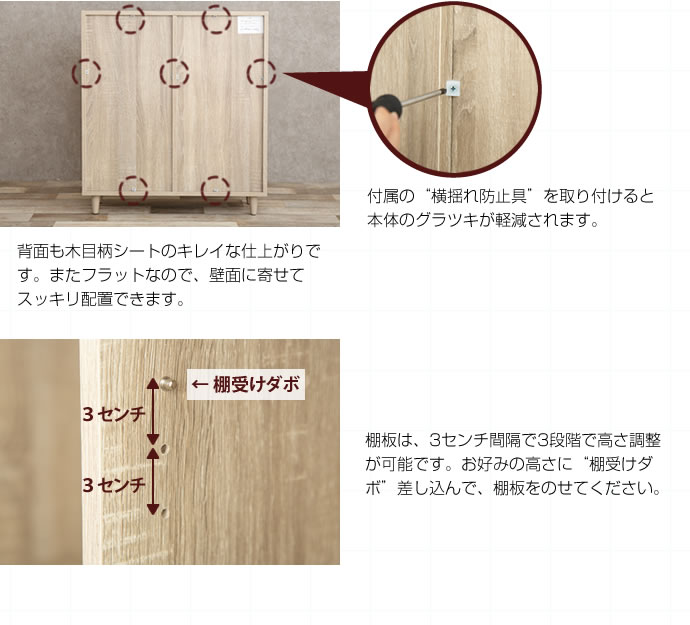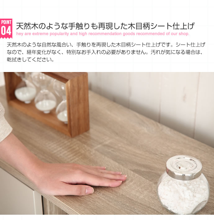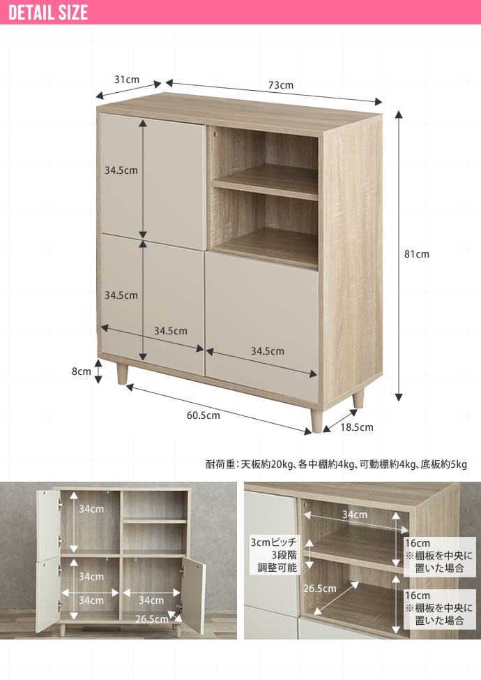 天板約20kg、各中棚約4kg、可動棚約4kg、底板約5kg