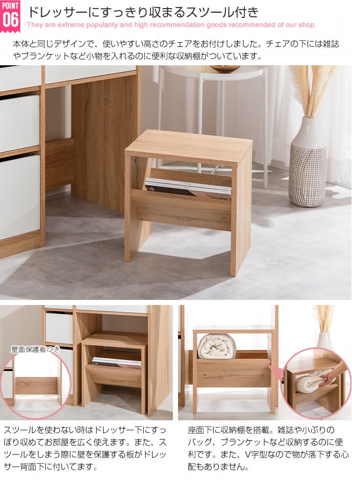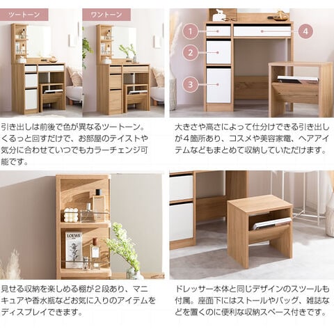 ドレッサー デスク 1面鏡 幅70cm 見せる棚付き 2口コンセント スツール付き 大容量 収納 ツートン 木製 ナチュラル かわいい 可愛い 韓国インテリア おしゃれ【送料無料】
