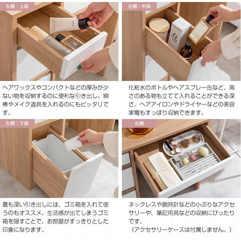 耐荷重 収納棚:約2kg、ドレッサー天板:約30kg、引き出し(左側上段):約3kg、引き出し(左側中段):約3kg、引き出し(左側下段):約5kg、引き出し(右側):約5kg、スツール座面:約80kg、スツール(収納棚):約10kg