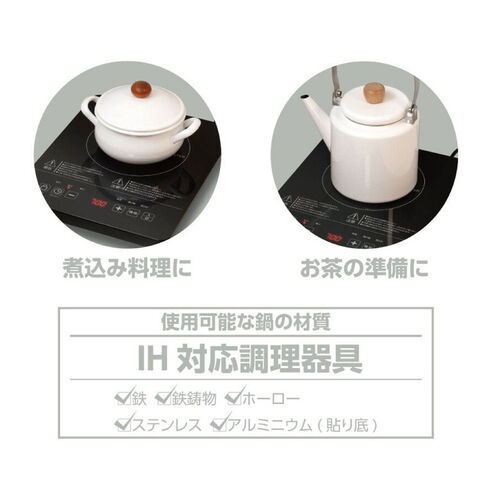 使用可能な鍋の材質:IH対応調理器具、鉄・鉄鋳鋳物・ホーロー・ステンレス・アルミニウム(貼り底)