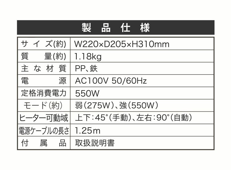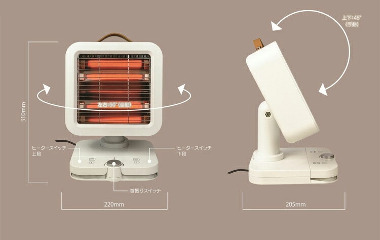 ヒーター可動域:上下45°(手動)、左右90°(自動)