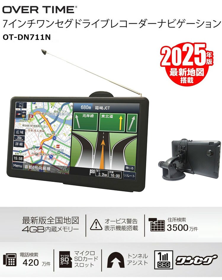 ポータブルナビ カーナビ 7インチ 2025年リリース最新地図搭載 ワンセグ搭載 OVERTIME デモ走行機能搭載 タッチパネル 2電源対応 ドライブアシスト OT-DN711 OVER TIME【送料無料】
