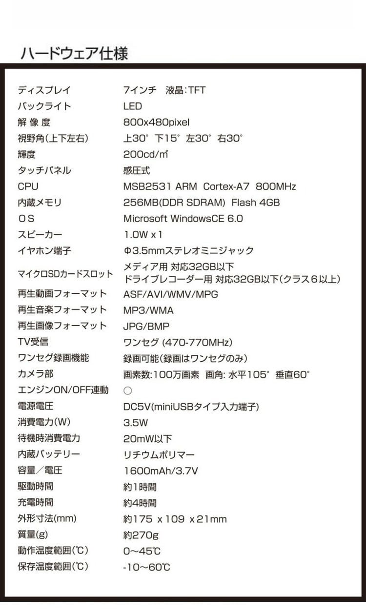 ワンセグ録画機能:録画可能(録画はワンセグのみ)