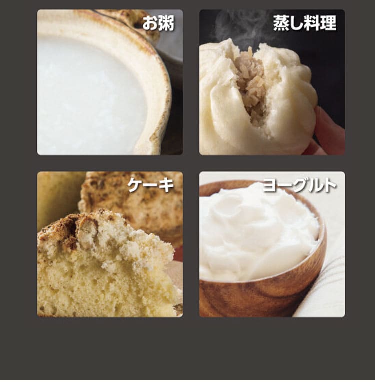 炊飯器としての通常炊飯・早炊きのほか、お粥、蒸し料理、ケーキ、ヨーグルトに最適化されたメニューがプリセットされています。簡単操作で火加減の見張りをすることなく、美味しい料理が出来上がります。また、保温機能も備えているので、温かい料理を好きなときに楽しめます。