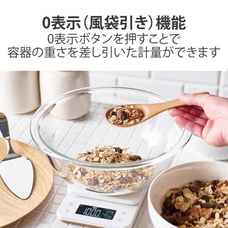 容器に入れて計量物を量る際、容器を乗せ0gセットボタンを押すことで容器の重さを差し引くことができます。
