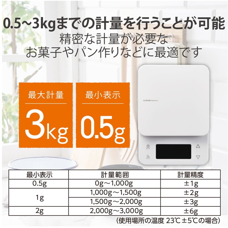 計測精度:0~1,000g:±1g単位、1,000~1,500g:±2g単位、1,500~2,000g:±3g、2,000~3,000g:±6g