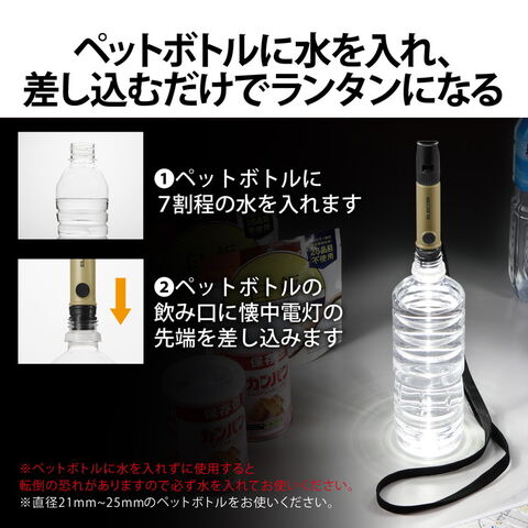■LEDライト側を水の入ったペットボトルに差し込むことで、簡易的なランタンとして使用することができます。