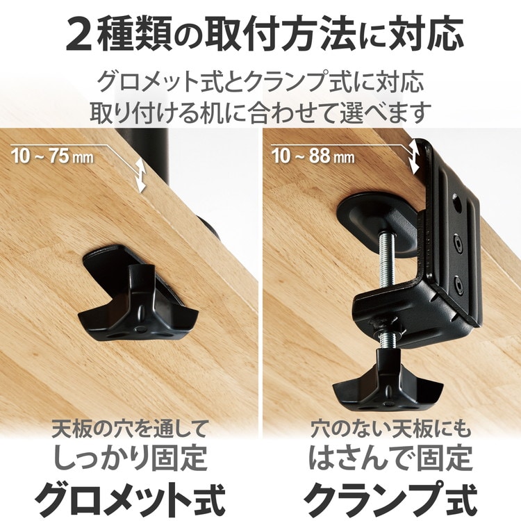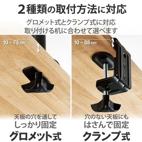 ■取り付け可能天板厚:クランプ:10~88mm、グロメット:10~75mm