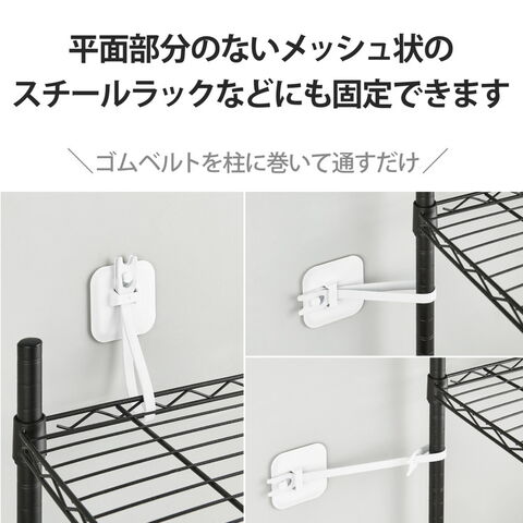■ゴムベルトを柱に巻いて通すことで、平面部分のないメッシュ状のスチールラックなどにも固定可能です。