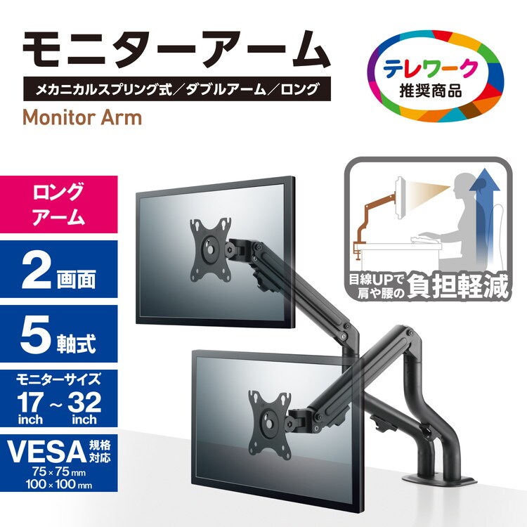 ■17~32インチサイズのモニターに対応するロングアームのメカニカルスプリング式ダブルモニターアームです。