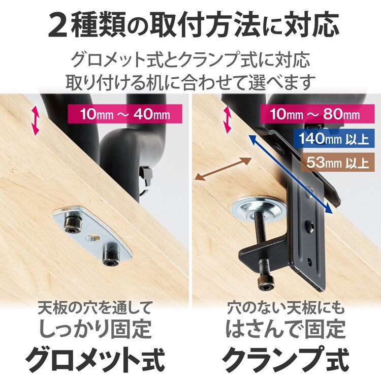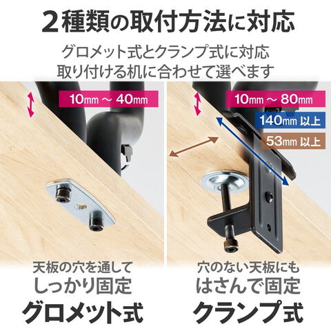 ■取り付け可能天板厚:クランプ:10~80mm、グロメット:10~40mm
