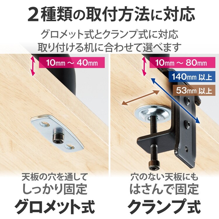 ■取り付け可能天板厚:クランプ:10~80mm、グロメット:10~40mm