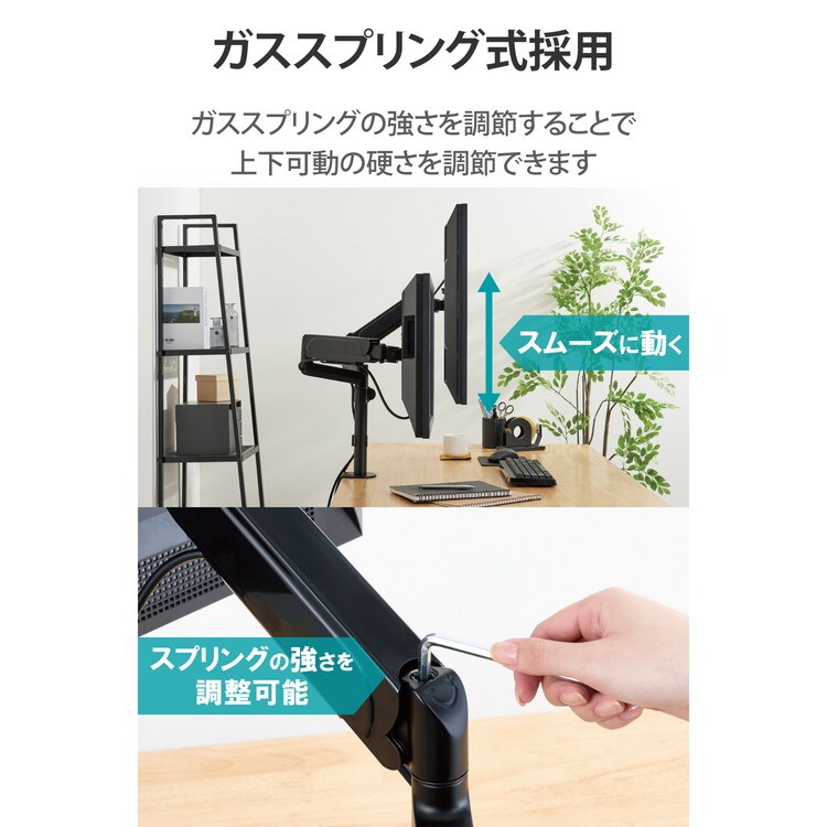 ■モニター取り付け後の可動がスムーズなのが特徴の製品です。ガススプリングの強さを調節することで、上下可動の硬さを調節することができます。