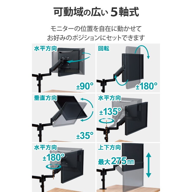 ■可動域の広い5軸可動のアームタイプで、高さが調節しやすい支柱付きです。