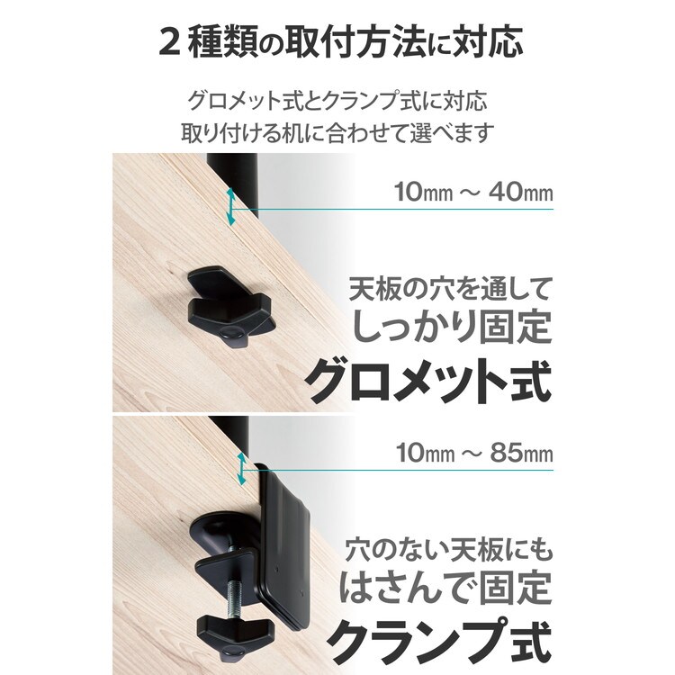 ■取り付け可能天板厚:クランプ(挟んで固定):10~85mm、グロメット(穴に通して固定):10~40mm
