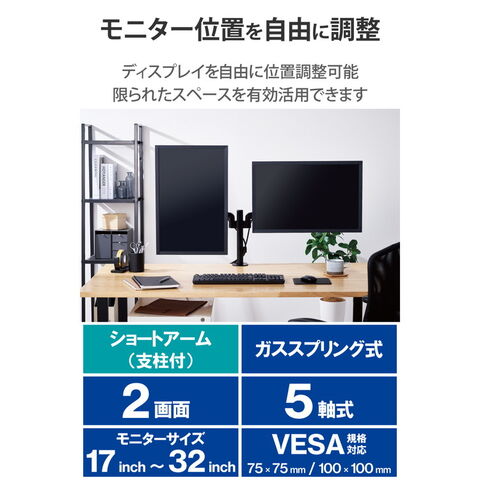 エレコム ELECOM モニターアーム ショート デュアル 2画面 支柱付 ガススプリング式 【 VESA規格対応 モニター 17~32インチ 耐荷重約1~9kg(×2) 対応 】 5軸 ブラック