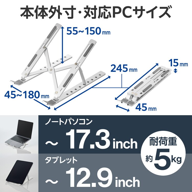 ■対応サイズ:10~17.3インチノートパソコン ■耐荷重:約5kg ■寸法:折り畳み時:幅約45mm×奥行約245mm×高さ約15mm、組み立て時:幅約45mm~約180mm×奥行約245mm×高さ約55mm~約150mm ■質量:約235g ■色:シルバー ■セット内容:ノートパソコンスタンド本体、ケース ■材質:アルミ合金、シリコン ■可動範囲:幅約45mm~約180mm×奥行き約245mm×高さ約55mm~約150mm