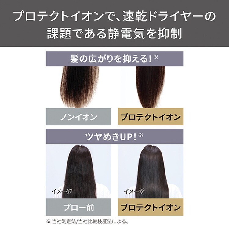 ■乾燥や髪摩擦による静電気の発生が、速乾ドライヤーの課題。プロテクトイオンは静電気を抑制し、ワンランク上の美髪に導きます。
