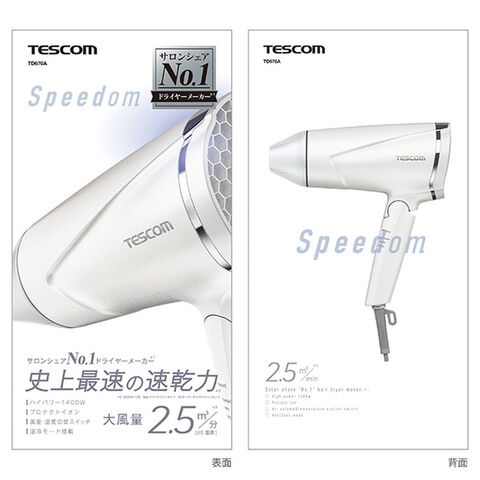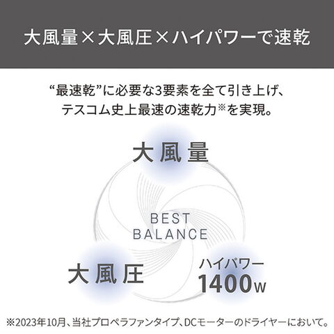 ■風量×風圧×ハイパワーのベストバランスによって、テスコム史上最速乾※2を実現しました。大風量:業界最大級※3の2.5m3/分※4(JIS基準)大風圧:従来機種※5から134%にUPハイパワー:1400W※6のパワーで大風量でもしっかり温かい風を送ります。