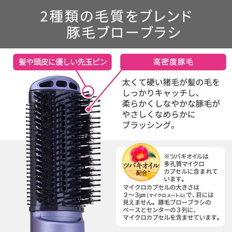 ■豚毛ブローブラシの黒色部分全面(ブラシセンター3列とブラシベース)にツバキオイルを配合したマイクロカプセルを含ませています。※ツバキオイルは多孔質マイクロカプセルに含まれています。マイクロカプセルの大きさは2~3マイクロメートルで目には見えません。