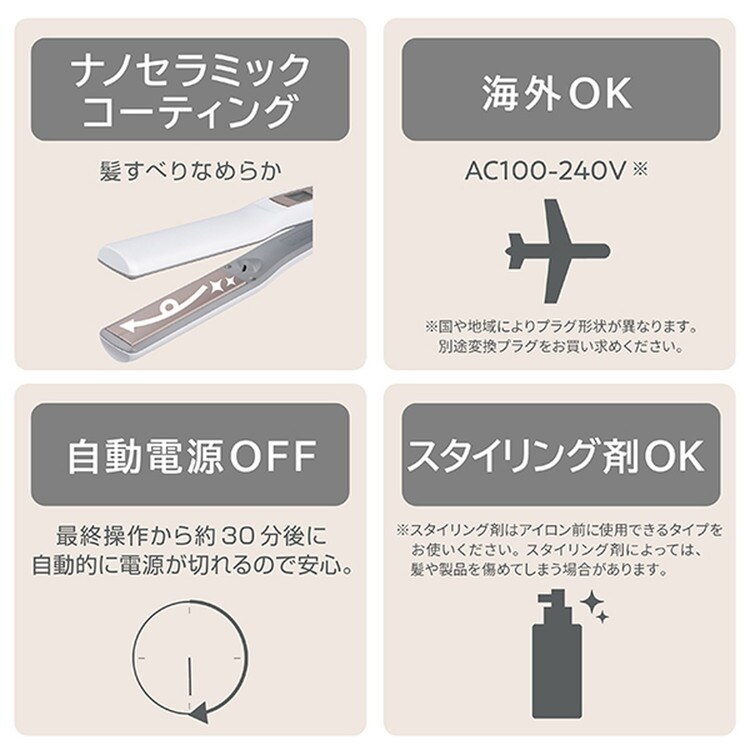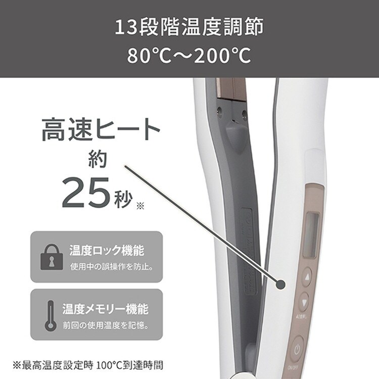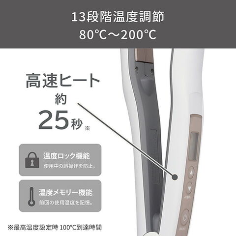 ■〈温度ロック機能〉温度設定後5秒で温度がロックされ、使用中の温度変更を防ぎます。〈温度メモリー機能〉前回使用した温度に自動で立ち上がるので、毎回温度設定するわずらわしさがありません。〈自動電源OFF機能〉最終操作後約30分で自動的に電源が切れるので安心です。