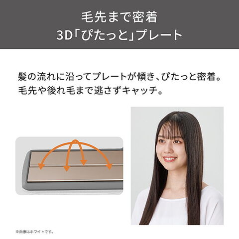 ■髪の流れに沿ってプレートが前後左右に傾いて、細かな毛束にも「ぴたっと」密着。毛先も後れ毛も逃さず、しっかりスタイリングできます。